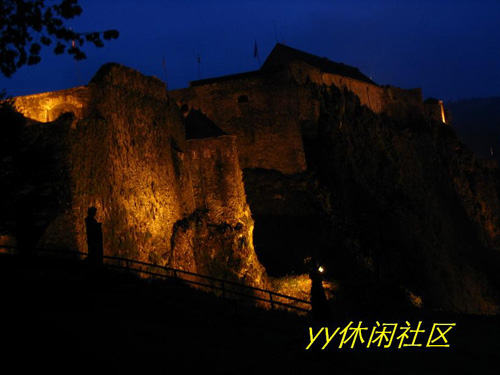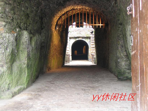 整个古堡静悄悄的,刚才看到的火把和人声都消失不见,入口售票处也无人看守,推开沉重的木质城门,吱吱嘎嘎声里一条黑暗深邃的甬道展现在眼前,"在这个漆黑孤独的环境里面",让人无形中增加了一种恐怖感受.我们正讨论是否大胆往里闯一闯的时候,甬道深处传来人声和火光,于是只好放弃"偷渡"的打算,等着问问我们是否还可以进去.